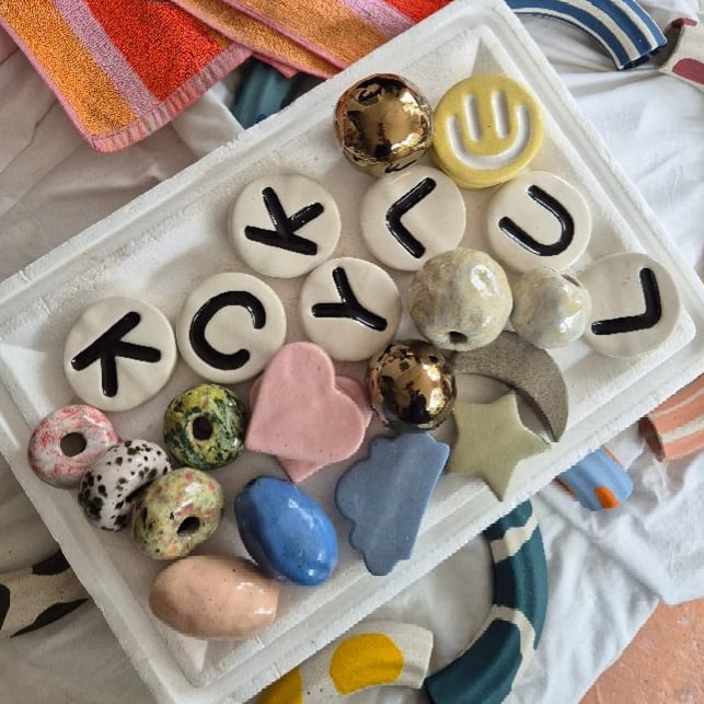 Loving nostalgia inspired by my sons. Tiny plastic friendship bracelet beads scaled up and hand-sculpted in stoneware clay.